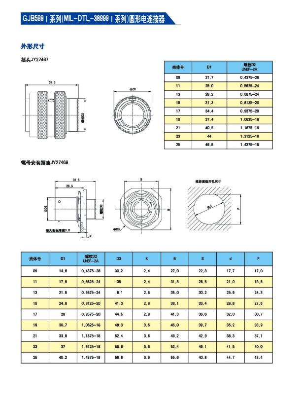 JY27468E15F15SN螺母安裝插座 * 符合GJB 599A(MIL-DTL-38999K)Ⅰ 系列* 卡口式快速連接 * 體積小,重量輕,接觸偶密度高 * EMI / RFI 屏蔽 * 接觸件壓接可取卸,防斜插設計 * 插座有盒式、墻式、前裝、后裝及螺母緊固式安裝等多種形式 * 具有抗高強度振動特性 * 符合GJB 1784A的標準尾部附件 * 適用于屏蔽電纜夾緊的專用尾部附件(Ti-Ni合金記憶環) * 9種殼體號,74種孔組排列 * 插合面界面及尾部具有密封結構,三防性能優良,防護等級可達到IP65