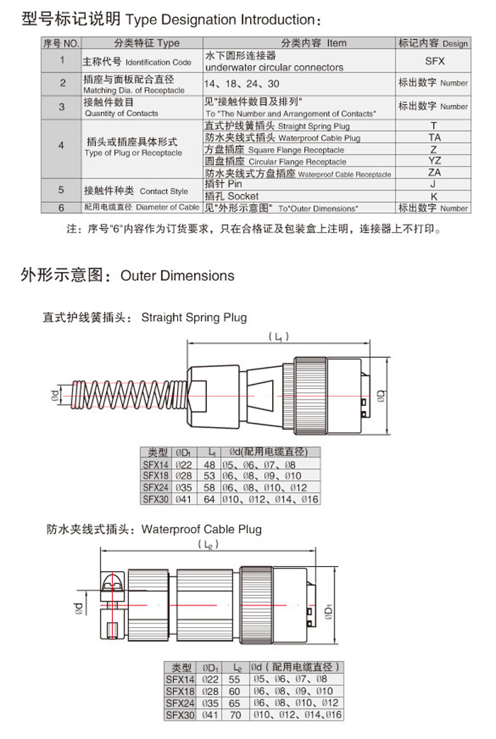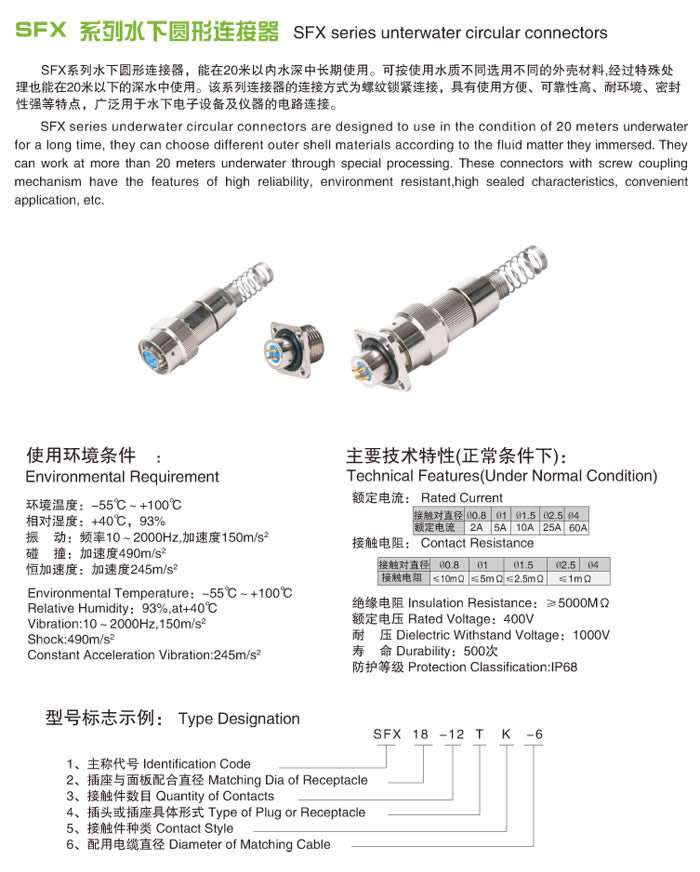 SFX型水密航空插頭座,能在20米以內(nèi)水深中使用的,可按使用水質(zhì)不同選用不同的外殼材料,經(jīng)過特殊處理也能在20米以下的深水中使用。該系列連接器的連接方式為螺紋鎖緊連接,具有使用方便、可靠性高、耐環(huán)境、密封性強(qiáng)等特點(diǎn),廣泛用于水下電子設(shè)備及儀器的電路連接。(SFX是螺紋連接,并且在FQN型的基礎(chǔ)上作了必要的加強(qiáng)。SFX型水下連接器的尾部附件,推薦差用FQN型的A型夾線板式,因?yàn)橛糜谒滤煽俊EcFQN相比,F(xiàn)QN的優(yōu)勢(shì)是:快速分離與連接和防自動(dòng)脫落。SFX型的優(yōu)勢(shì)是:防水可靠和堅(jiān)固耐用。)http://m.xinchunsheng.com