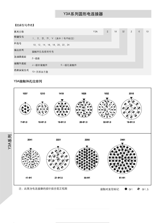 Y3A-2041ZK10/TJ5直插鎖緊航空連接器,芯譜排列不規(guī)范,一般成圓圈型,與Y3系列航空插頭排列不一樣,型號種類多一些,接觸件有粗有細(xì),電流也有大小,尾部有兩種熱縮套管式I  II型,插座是固定方法蘭形式,可以灌膠密封,承受0.2MPA壓力。