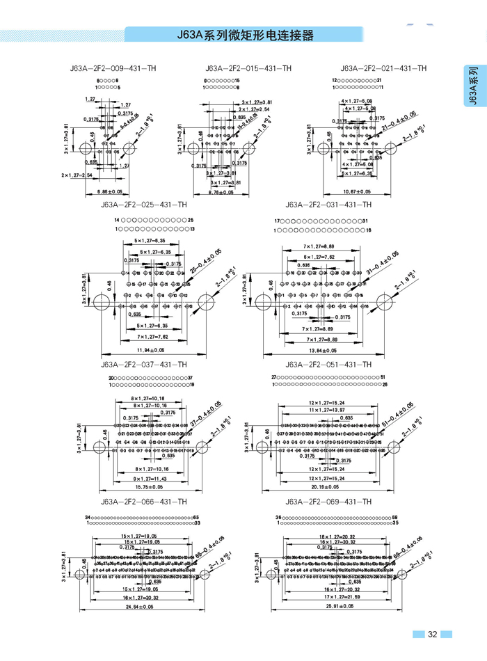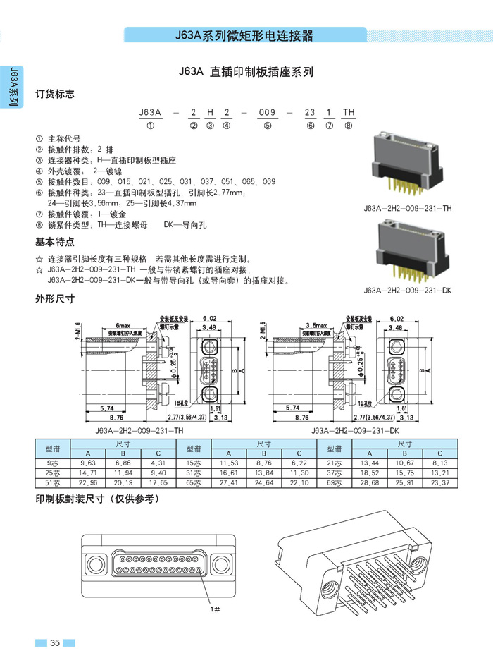 J63A 型90°彎插印制板航空連接器,端接方式是印制板,而且是90°彎腳,座殼體與墻體正常安裝,印制板平行放置,與插針直接焊接。要說明的是印制板可以立著放,這時選用直式插針焊接。以下是選購圖: