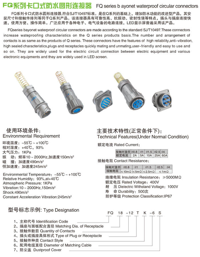 FQ-1803ZJ/TK圓形防水電連接器,接觸件3芯,2.5mm針孔,額定電流可達30A,螺旋卡口連接,插頭與插座之間有密封圈設計,增加防水功能,插頭尾巴有直式和彎式,夾線防水尾部,出線孔徑客戶可選擇,訂貨數量多,可以定做不同大小的電纜罩。