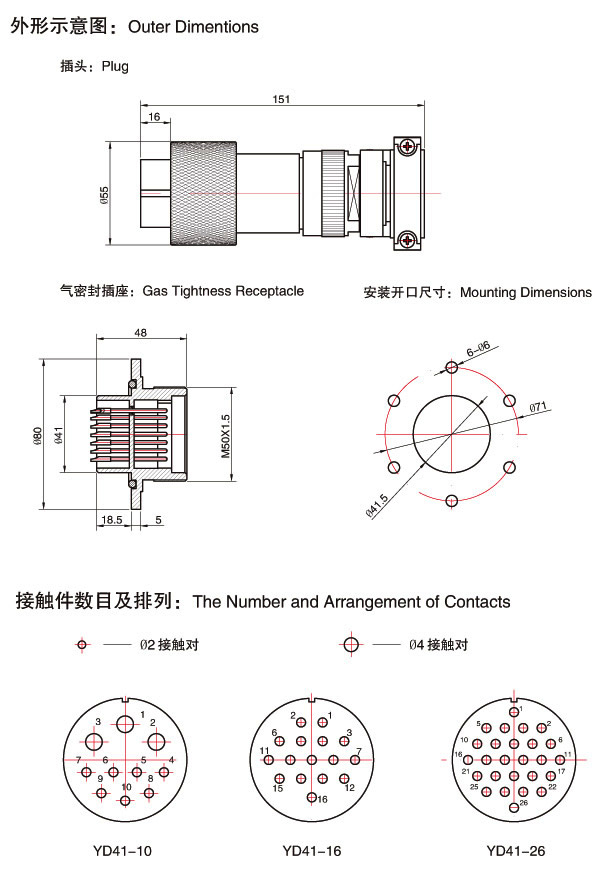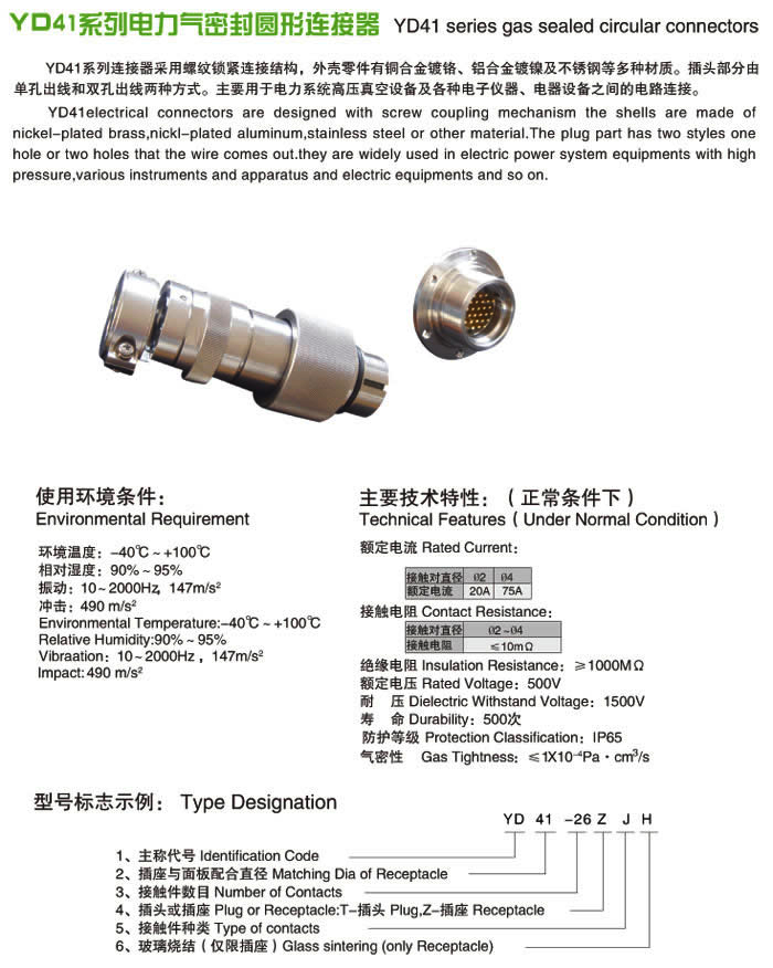 YD41系列連接器采用螺紋鎖緊連接結構,外殼零件有銅合金鍍鉻、鋁合金鍍鎳及不銹鋼等多種材質。插頭部分由單孔出線和雙孔出線兩種方式,插座分為注塑與玻璃燒結兩種形式,其中玻璃燒結成型工藝,大大提高了氣密性(1X10%*p-4%*p %*bPa·cm%*p3%*p %*b/s)。主要用于電力系統高壓真空設備及各種電子儀器、電器設備之間的電路連接,在高壓斷路器及各種充氣柜中應用廣泛。