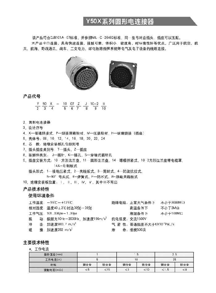 Y50系列航空插頭包括公制、英制、電源三大類電連接器。均為內(nèi)螺旋槽卡銷鎖緊式。具有快捷連接與分離,體積小、重量輕,密封性能好,抗拉性能優(yōu)之特點(diǎn)。插頭電纜罩有七種安裝方式,殼體分屏蔽與非屏蔽,電纜引出有直式和彎式,端接方式為焊接式。品種多,規(guī)格全。Y50X是公制航空插頭,相對(duì)體積要大些。而且該產(chǎn)品可根據(jù)用戶需求改裝成濾波連接器,真空氣密封連接器。 均參照GJB101A—97,GJB598A—96,MIL—C—26482等標(biāo)準(zhǔn)的要求。適用于戰(zhàn)略、戰(zhàn)術(shù)系統(tǒng),野外作業(yè)等電訊號(hào)、電能的連接。