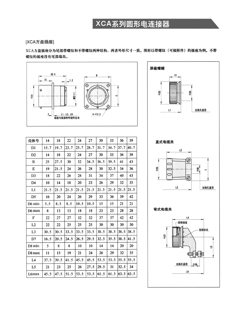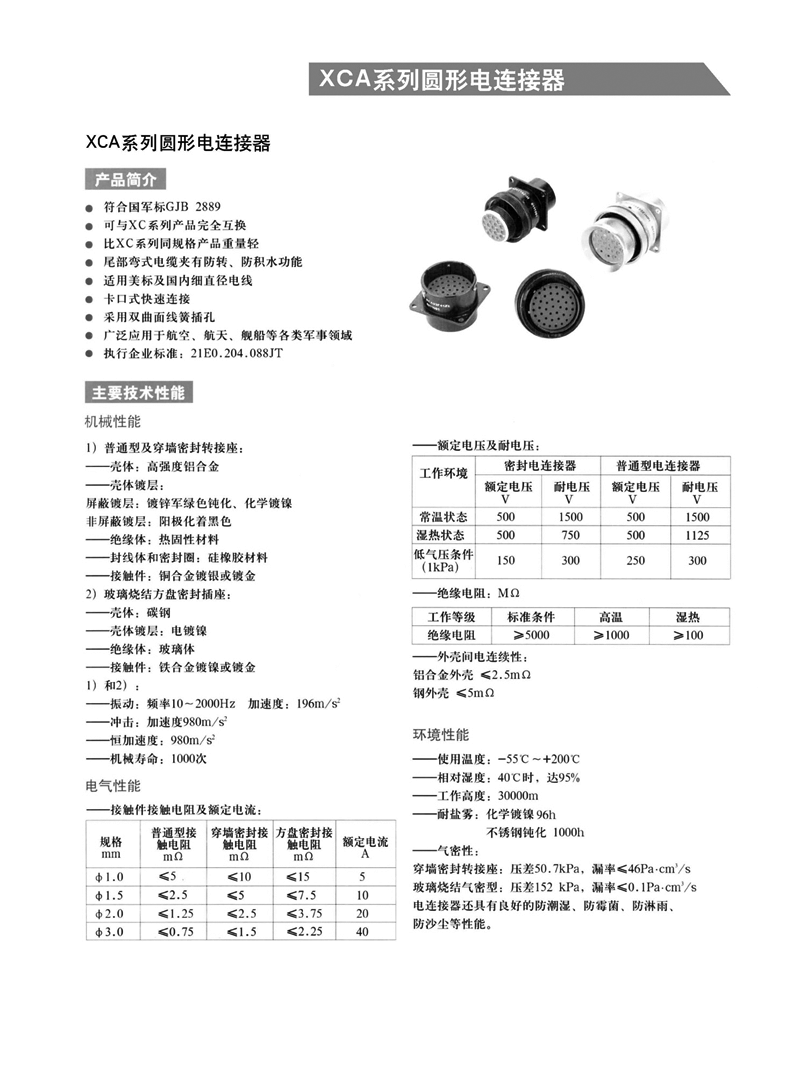 XCA系列航空插頭符合GJB2889標(biāo)準(zhǔn),可與XC系列產(chǎn)品完全互配,具備比XC系列同規(guī)格產(chǎn)品重量輕的特點(diǎn),殼體材料為高強(qiáng)度鋁合金,接觸件有后松后卸壓接式,其中插孔為線簧孔,具有插拔柔和、接觸電阻小、防潮、防鹽霧、防霉菌等特性,適用美標(biāo)及國內(nèi)細(xì)直徑電線,尾部彎式電纜夾有防轉(zhuǎn)、防積水功能。XCA系列航空插頭廣泛應(yīng)用于航空、航天、兵器、艦船、野戰(zhàn)通信等軍事領(lǐng)域,以及郵電通訊、鐵路、計算機(jī)和各種儀器、儀表的線路連接。