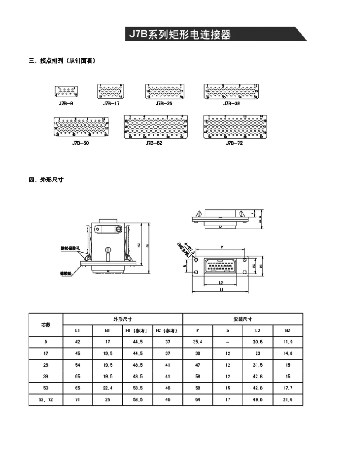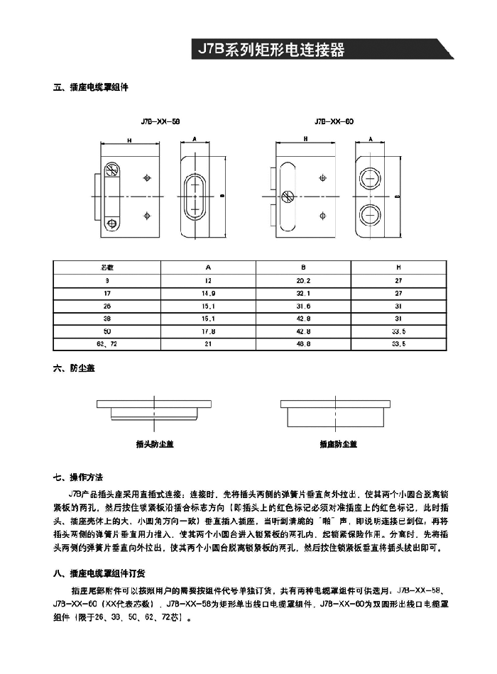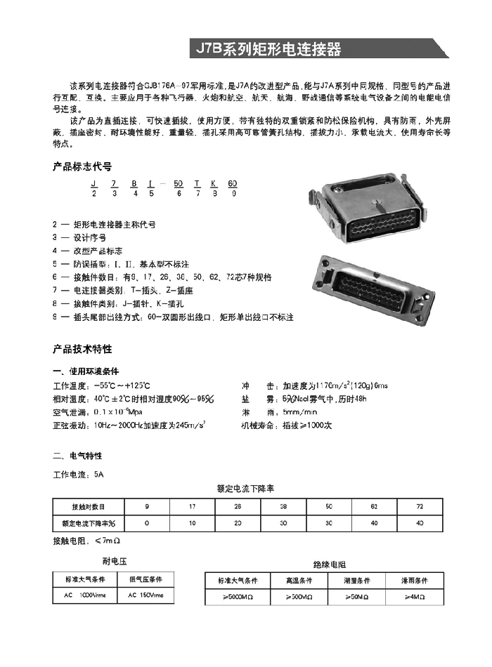 J7B矩形航空插頭為直插連接,可快速插拔,使用方便,帶有獨特的雙重鎖緊和防松保險機構(gòu),具有防雨,外殼屏蔽,插座密封,耐環(huán)境好,重量輕,插孔采用高可靠管簧孔結(jié)構(gòu),插拔力小,承載電流大,使用壽命長等特點。