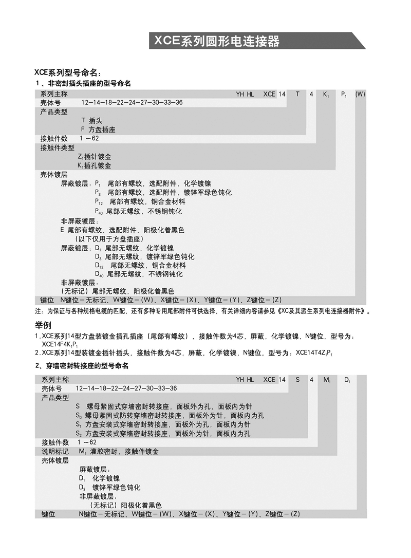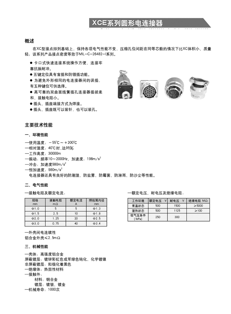 XCE系列軍用圓形電連接器,是在XC型譜排列基礎上,壓縮接點排列孔位間距,在相同接觸對數下比XC體積小,重量輕,殼體為高強度鋁合金材料,插頭、插座既可裝針也可裝孔,其連接方式為卡口式快速連接和分離,操作方便,連接可靠,抗振耐沖,接觸件有焊接式,其中插孔為線簧孔,具有插拔柔和、接觸電阻小、防潮、防鹽霧、防霉菌、防淋雨等特性,主要應用于艦船等各種惡劣環境領域,也可應用于航空、航天、兵器、野戰通信等軍事領域以及郵電通訊、鐵路指揮系統、計算機、航海和各種儀器、儀表的線路連接。
