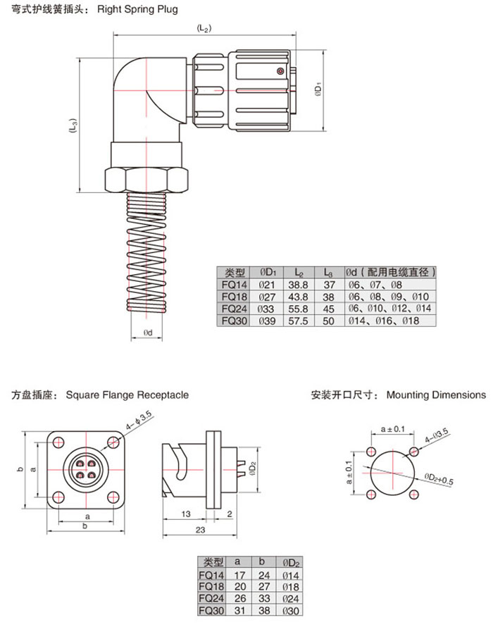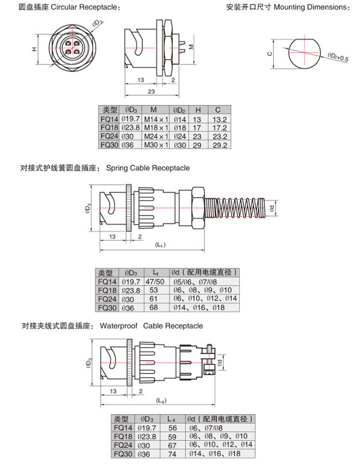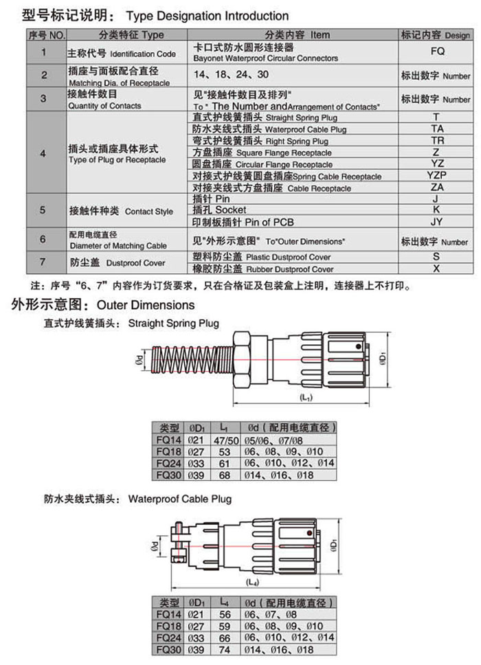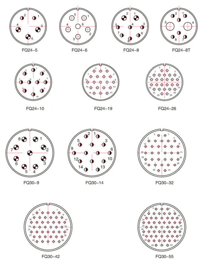 FQ 系列防水圓形電連接器符合電子工業部元器件工業管理局局標準DZ4Q/RE008-84制造,產品結構先進,可靠性高,插孔接觸采用高可靠的鼠籠式彈性接觸代替傳統的線簧結構,產品具有接觸電阻小、抗振動、耐沖擊、密封性強等特點,插頭座連接為卡口式快速連接,使用簡單,操作方便,被廣泛應用于各種電子設備間的電氣連接。