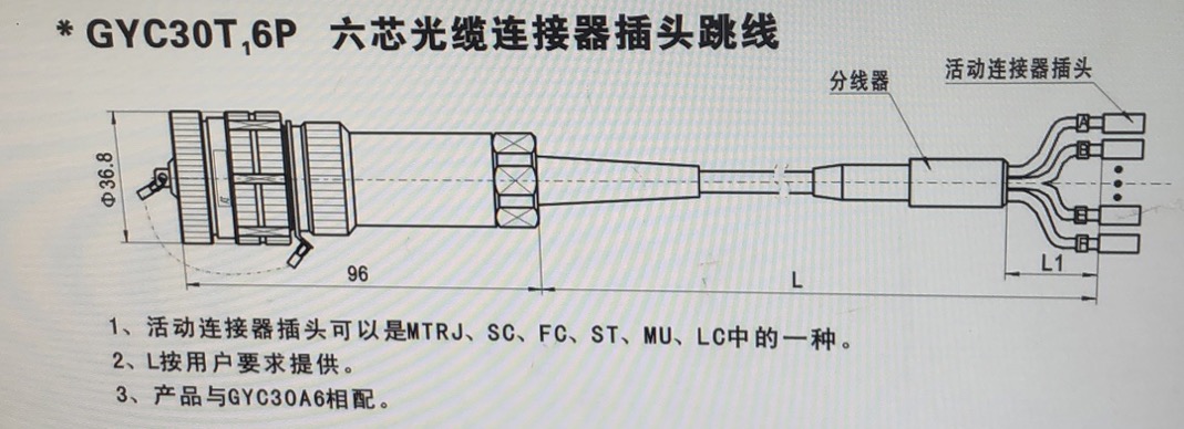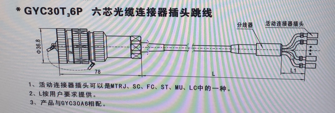 GYC30T36P-6FC-C6*6-3S5/0.3光纖連接器介紹 GYC30T36P-6FC-C6*6-3S5/0.3光纖連接器,看起來復雜,扯開說明一下,也許便于大家選用。GYC30是公司命名型號。 T3和T1都是表示尾部,長短不一樣。6FC-C6*6表示6毫米光纜線,帶6根跳線。3S5/0.3表示主線5米,跳線0.3米長。要說明 是光纜頭有多種型號,線長短可以選擇,不是固定的。